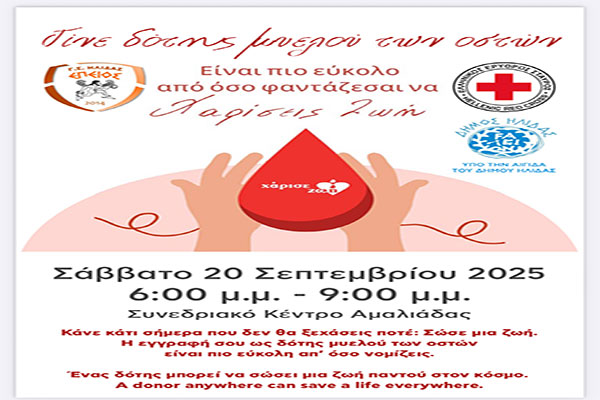 Επειός Ήλιδας: «Χάρισε ζωή»-Η ημερίδα για τη δωρεά μυελού των οστών στις 20/9