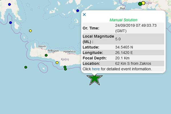 Σεισμός 5R σε θαλάσσια περιοχή νότια της Κρήτης