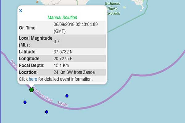 Σεισμός 3,7R νοτιοδυτικά της Ζακύνθου