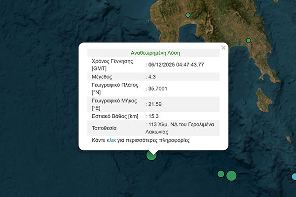 Σεισμός 4,3 βαθμών της κλίμακας Ρίχτερ ανοικτά της Λακωνίας