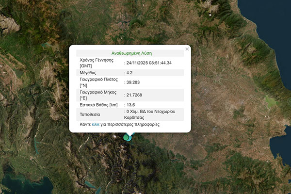 Σεισμική δόνηση 4,2 Ρίχτερ στην Καρδίτσα