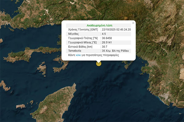 Σεισμός 4,5 Ρίχτερ στα ανοιχτά της Ρόδου
