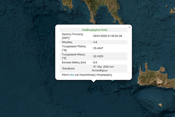 μεγέθους 4,6 βαθμών της κλίμακας Ρίχτερ, σημειώθηκε στις 03:50 στον θαλάσσιο χώρο δυτικά της Κρήτης.