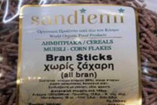 η Περιφερειακή Διεύθυνση Αττικής, στο πλαίσιο της διενέργειας τακτικών ελέγχων, διαπίστωσε ότι στην επισήμανση του προϊόντος "sandiemi – Bran sticks χωρίς ζάχαρη (all bran)", δεν αναγράφεται ότι το προϊόν περιέχει γλουτένη και μπορεί να περιέχει σόγια, γάλα και ίχνη ξηρών καρπών.
