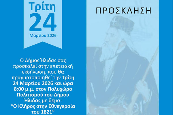 «Ο Κλήρος στην Εθνεγερσία του 1821» – Επετειακή εκδήλωση από το Δήμο Ήλιδας στον Πολυχώρο Πολιτισμού Αμαλιάδας