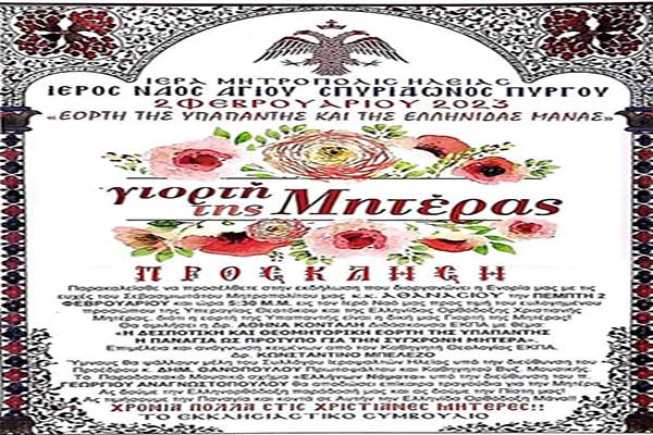 Εκδήλωση για την εορτή της Μητέρας 2 Φεβρουαρίου, στον Ι.Ν. Αγ. Σπυρίδωνος Πύργου