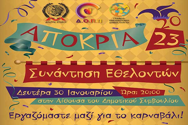 Δήμος Πύργου: Συνάντηση εθελοντών για τις Απόκριες τη Δευτέρα 30/1