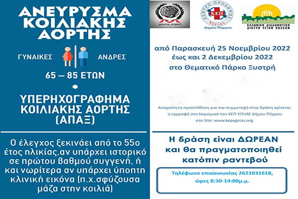 Δωρεάν Πρόγραμμα Ελέγχου για το Ανεύρυσμα Κοιλιακής Αορτής από το ΚΕΠ Υγείας του Δήμου Πύργου