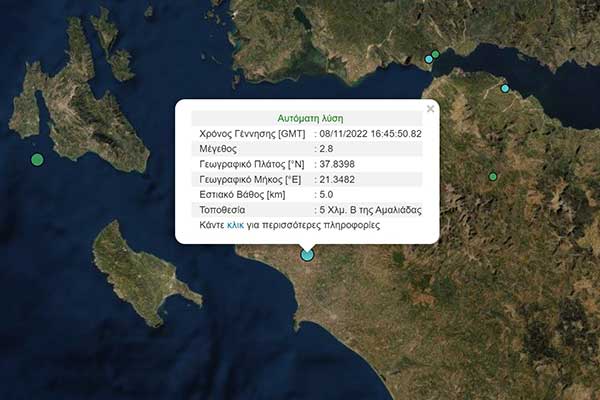 Ηλεία: Σεισμός 2,8 Ρίχτερ - Βόρεια της Αμαλιάδας το επίκεντρο