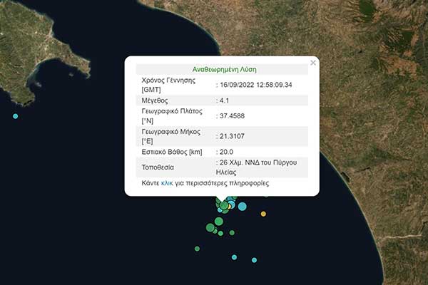Ηλεία: Αισθητός σεισμός 4,1 Ρίχτερ - Ανοιχτά του Κατακόλου το επίκεντρο