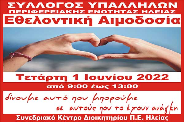 Σύλλογος Υπαλλήλων ΠΕ Ηλείας: Εθελοντική Αιμοδοσία την Τετάρτη 1 Ιουνίου