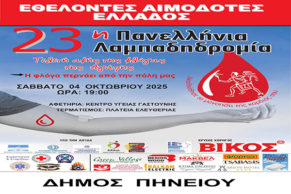 Ο Δήμος Πηνειού φωτίζει την 23η Λαμπαδηδρομία Εθελοντών Αιμοδοτών στην Γαστούνη