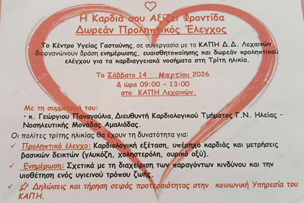Δήμος Ανδραβίδας-Κυλλήνης: Δράση Προληπτικού Καρδιαγγειακού Ελέγχου στα Λεχαινά