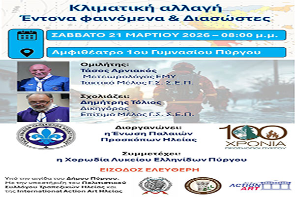 Ένωση Παλαιών Προσκόπων Ηλείας: Στις 21 Μαρτίου η εκδήλωση «Κλιματική Αλλαγή -Έντονα φαινόμενα και Διασώστες» με ομιλητή τον Τάσο Αρνιακό