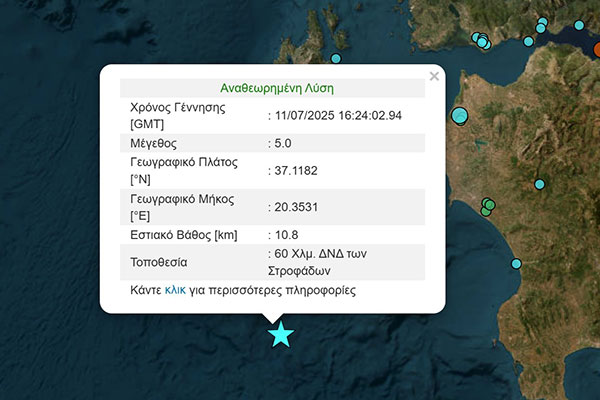 Ηλεία: Αισθητός σεισμός 5 Ρίχτερ - Δυτικά των Στροφάδων το επίκεντρο