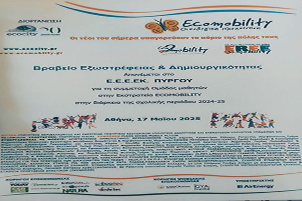 Το ΕΕΕΕΚ Πύργου βραβεύτηκε για τη συμμετοχή του στο πρόγραμμα Eco Mobility 2024-2025