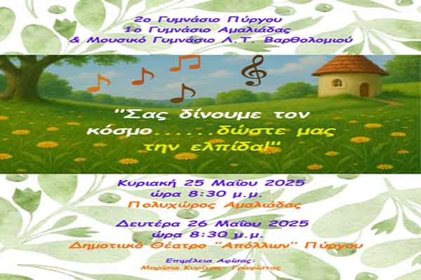 «Σας δίνουμε τον κόσμο.…δώστε μας την ελπίδα!»: Διασχολική εκδήλωση 2ου Γυμνασίου Πύργου, 1ου Γυμνασίου Αμαλιάδας και Μουσικού Γυμνασίου –Λ.Τ. Βαρθολομιού