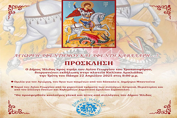 Δήμος Ήλιδας: Με δύο ξεχωριστές εκδηλώσεις -σε πλατεία Καλίτσα και Κοινότητα Αυγείου- θα γιορτάσει τον Άγιο Γεώργιο