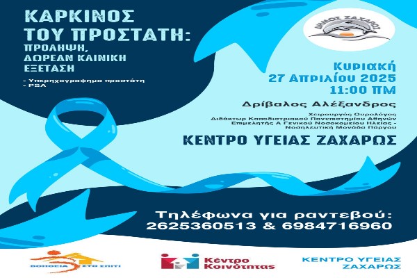 Δήμος Ζαχάρως: Ενημερωτική Εκδήλωση για τον Καρκίνο του Προστάτη την Κυριακή 27 Απριλίου