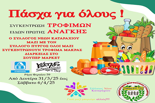 Σύλλογος Νέων Καταραχίου-Αγία Μαρίνα: Συγκέντρωση τροφίμων και ειδών πρώτης ανάγκης ενόψει Πάσχα