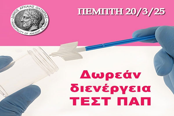 Δήμος Αρχαίας Ολυμπίας: Δωρεάν προληπτικός γυναικολογικός έλεγχος ΤΕΣΤ ΠΑΠ την Πέμπτη 20 Μαρτίου