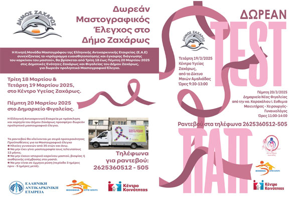 Δήμος Ζαχάρως: Δωρεάν Μαστογραφικός Έλεγχος και Τεστ ΠΑΠ σε Ζαχάρω και Νέα Φιγαλεία
