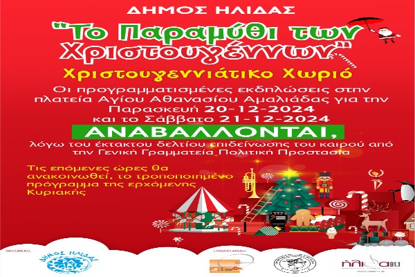Δήμος Ήλιδας: Αναβολή των δύο πρώτων ημερών για το Χριστουγεννιάτικο χωριό “Παραμύθι των Χριστουγέννων”