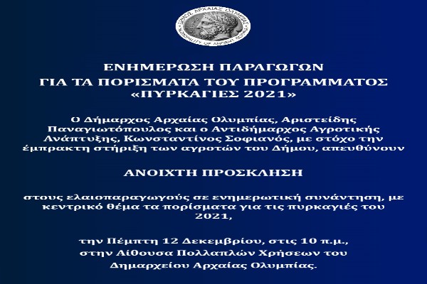 Αρχαία Ολυμπία: Ενημέρωση ελαιοπαραγωγών για τα πορίσματα του προγράμματος «ΠΥΡΚΑΓΙΕΣ 2021»