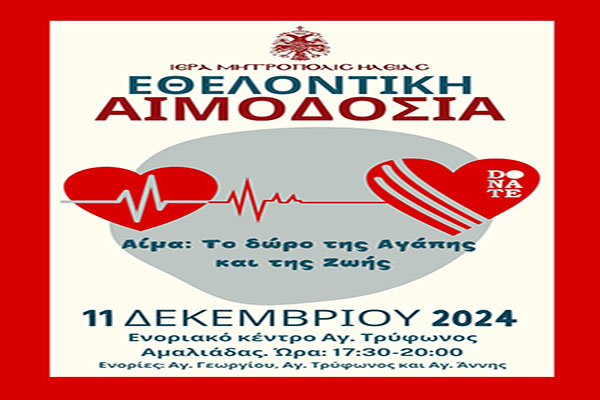 Εθελοντική αιμοδοσία με την αιγίδα της Ιεράς Μητροπόλεως Ηλείας στην Αμαλιάδα