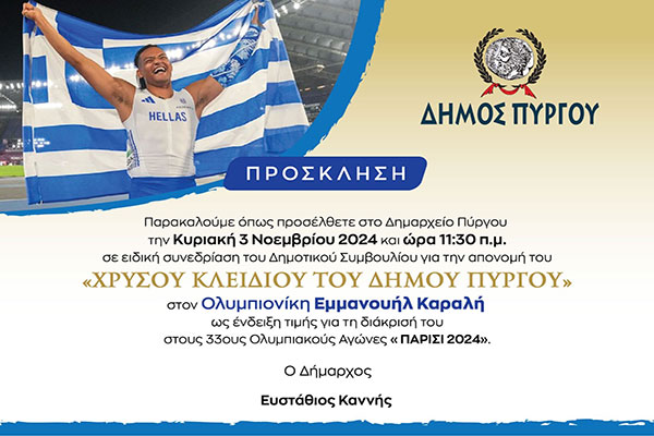 Δήμος Πύργου: Το Χρυσό Κλειδί της πόλης στον Ολυμπιονίκη Εμμανουήλ Καραλή την Κυριακή 3/11