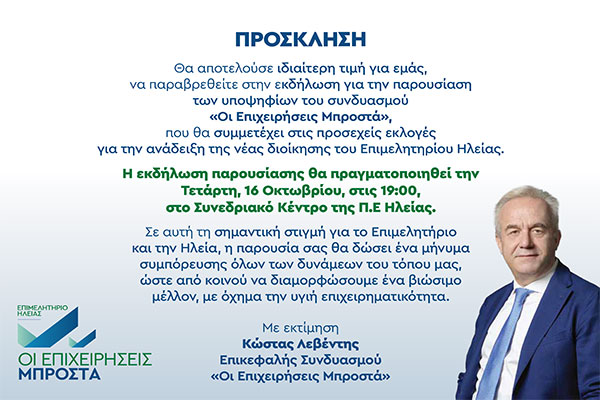 «Οι Επιχειρήσεις Μπροστά»: Την Τετάρτη 16/10 η παρουσίαση των υποψηφίων του Συνδυασμού