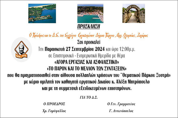 Σύλλογος Εργαζομένων Δ.Πύργου-Αρχ.Ολυμπίας-Ζαχάρως: Επιστημονική-Ενημερωτική Ημερίδα την Παρασκευή 27/9