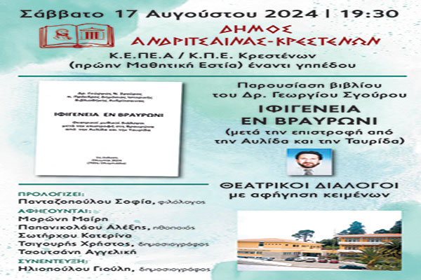 «Ιφιγένεια εν Βραυρώνι» στο ΚΠΕ Κρεστένων: Παρουσίαση του βιβλίου του Δρ. Γεωρ. Σγούρου το Σάββατο 17 Αυγούστου
