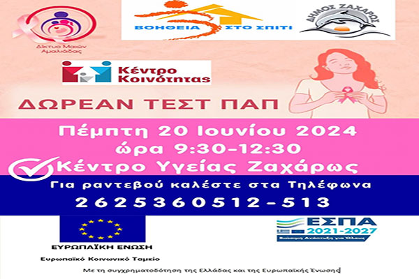 Δήμος Ζαχάρως: Δωρεάν τεστ ΠΑΠ, την Πέμπτη 20/6 στο Κέντρο Υγείας Ζαχάρως