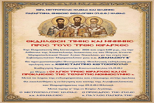«Οι Τρεις Ιεράρχες και η Τεχνητή Νοημοσύνη» – Εκδήλωση Τιμής από την Ι.Μ. Ηλείας και την Ένωση Θεολόγων