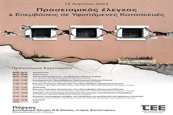Πύργος: Σεμινάριο στις 13/4 για τον προσεισμικό έλεγχο στα Δημόσια κτίρια, από το ΤΕΕ Δυτικής Ελλάδας