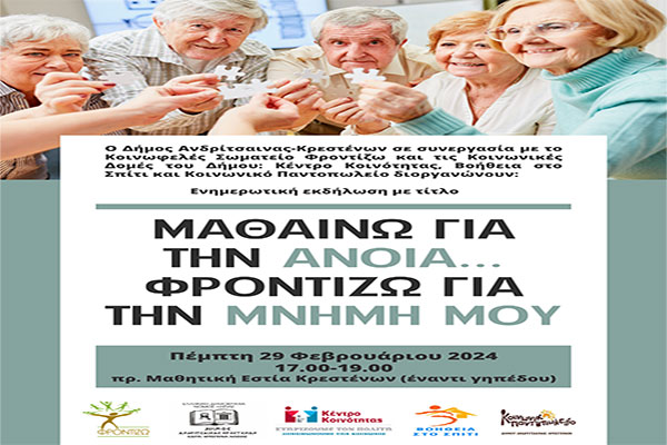 Δήμος Ανδρίτσαινας-Κρεστένων: «Μαθαίνω για την Άνοια… Φροντίζω για την Μνήμη μου»