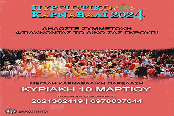 Δήμος Πύργου: Συνεχίζονται οι ετοιμασίες για το Πυργιώτικο Καρναβάλι 2024 - Δηλώσεις συμμετοχής για τα γκρουπ