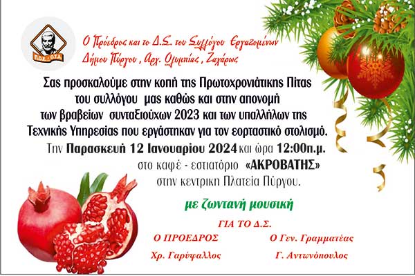 Σύλλογος Εργαζομένων Δ.Πύργου-Αρχ.Ολυμπίας-Ζαχάρως: Την Παρασκευή 12/1 η κοπή της Πρωτοχρονιάτικης πίτας