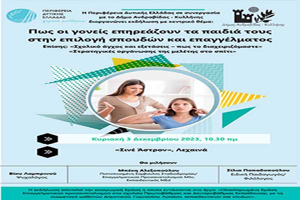 Ενημερωτική εκδήλωση στα Λεχαινά από την ΠΔΕ και τον Δήμο Ανδραβίδας-Κυλλήνης: Γονείς και λήψη επαγγελματικής απόφασης των παιδιών τους
