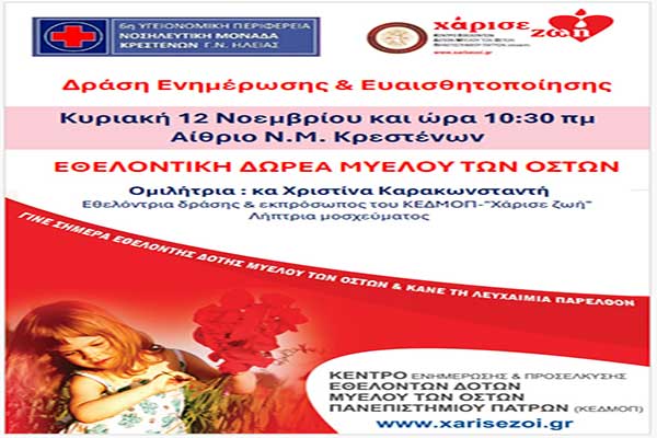 Νοσηλευτική Μονάδα Κρεστένων: Δράση ενημέρωσης και ευαισθητοποίησης για την εθελοντική δωρεά μυελού των οστών στις 12/11