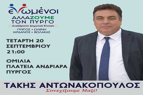 «Ενωμένοι αλλάζουμε τον Πύργο»: Ομιλία Τάκη Αντωνακόπουλου στην πλατεία Ανδριάρα (Τετάρτη 20/9, ώρα 21.00)