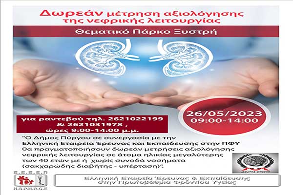Δήμος Πύργου: Πρόγραμμα δωρεάν ελέγχου νεφρικής λειτουργίας την Παρασκευή 26/5