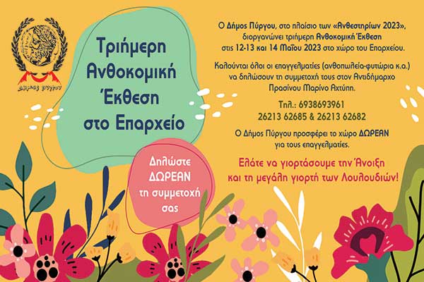 Δ. Πύργου: Τριήμερη Ανθοκομική Έκθεση στο Επαρχείο - Δηλώσεις συμμετοχής