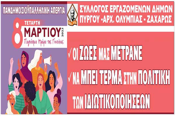 Σωματείο Εργαζομένων στα Εμπορικά Καταστήματα & Υπηρεσίες Ηλείας-Συνδικάτο Οικοδόμων Ν.Ηλείας: Κάλεσμα στην απεργία της 8ης Μάρτη