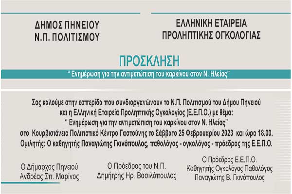 Εσπερίδα στο Κουρβισιάνειο Πολιτιστικό Γαστούνης: Αντιμετώπιση του καρκίνου στον Ν. Ηλείας