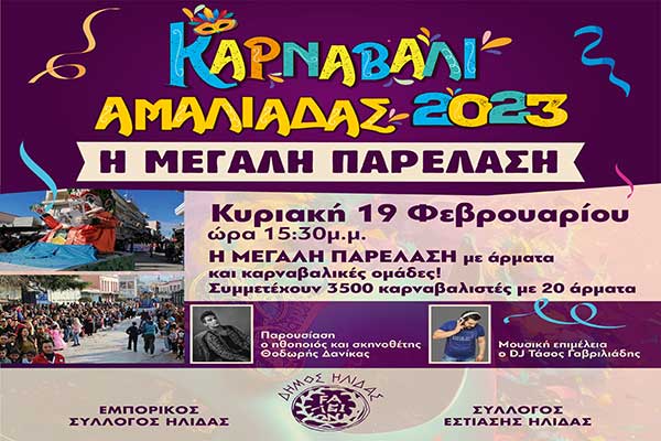 Με μεγάλη συμμετοχή θα πραγματοποιηθεί η παρέλαση στο Καρναβάλι Αμαλιάδας 2023 την Κυριακή 19 Φεβρουαρίου στις 15.30μμ