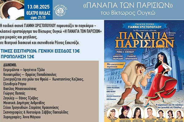35ο Διεθνές Φεστιβάλ Αρχαίας Ήλιδας: Η Παιδική Σκηνή του Γιάννη Χριστόπουλου παρουσιάζει την «Παναγία των Παρισίων» στο Θέατρο της Αρχαίας Ήλιδας
