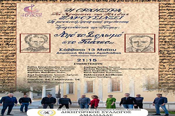 "Τα Χρώματα της Ήλιδας": Το Σάββατο 13 Μαΐου η μουσική παράσταση "Τραγουδώντας την Ποίηση, από τον Σολωμό στον Γκάτσο" στην Αμαλιάδα
