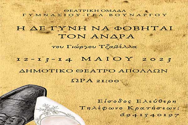 Θεατρική Ομάδα Γυμνασίου - ΓΕΛ Βουνάργου: “Η δε γυνή να φοβήται τον άνδρα” στις 12,13 & 14 Μαΐου στο Θέατρο "Απόλλων"